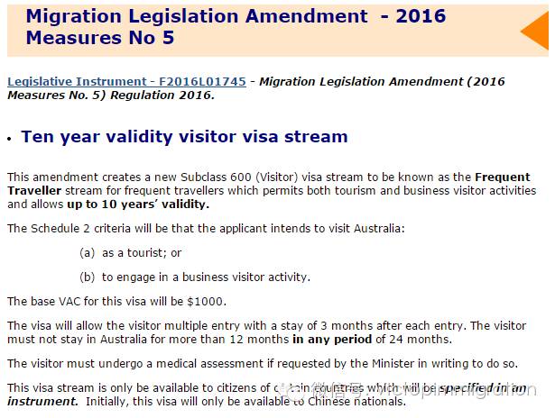 ● 十年旅游签证:签证类别依然属于600签证的新的下分类-Frequent traveller visa (常旅访客签证)