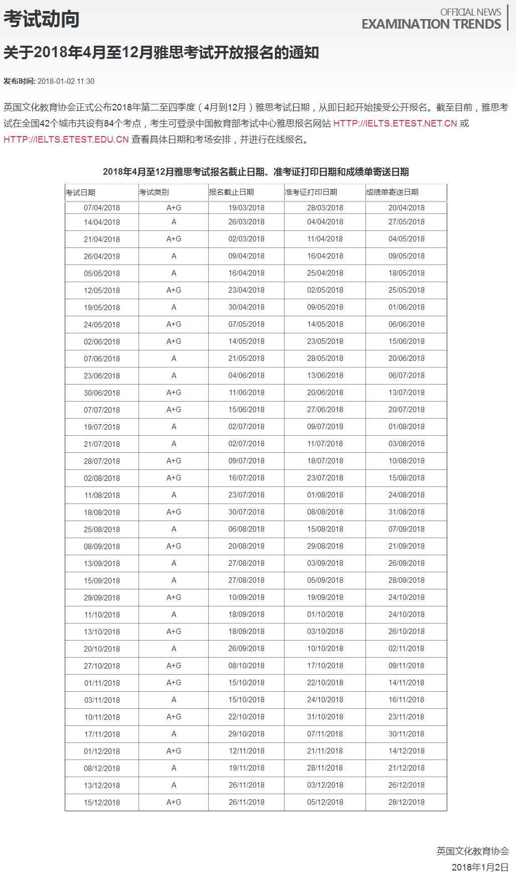 同时,官网还发布了2018年最新的雅思考试时间表——