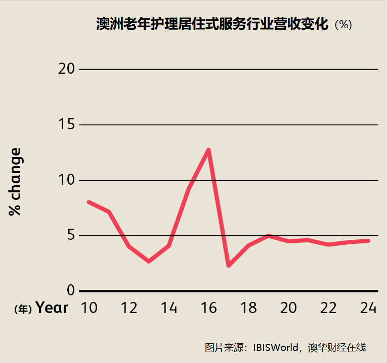 IBIS World认为,尽管澳大利亚人口老龄化对政府支出计划构成了挑战,老年护理服务业的收入会持续上涨,尤其是未来五年。随着越来越多的老年人走进养老院,及各种疾病及慢性病的治疗需求上涨,行业收入将加速增长。