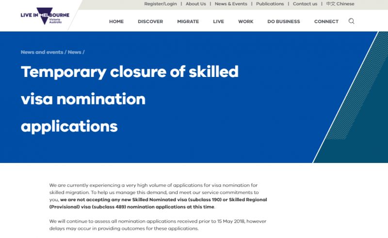 2018年5月15日,维州宣布暂停受理技术移民担保申请,投资类担保申请仍然开放。