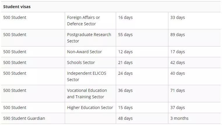 根据上图显示,6月份的学生签证审批速度有提高,500学生签证Higher Education Sector,也就是我们平常申请本科和授课型硕士课程的学生签证审批时间大概从15天到37天。而申请VET课程(相当于Tafe的培训课程)签证的审批时间则要相对长一点,需要大概36天到71天。对于590学生监护人签证来说,90%的签证审批时间是需要等待3个月,需要申请学生监护人签证的申请人需要提早做好准备。